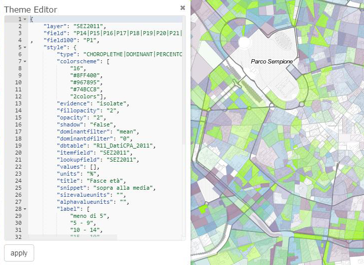 Every thematic map can easily be customized by the user by dedicated tools or by changing the theme definition directly by a code editor, realized with the ACE online code editor.